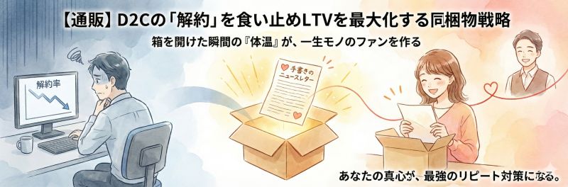 ランチェスター戦略(弱者の戦略)に基づけば、資本力のある大手と同じような「割引クーポン」で戦うのは得策ではありません。中小規模のD2Cこそ、「人としての体温」を箱の中に忍ばせることで、大手には真似できない絆を作れるのです。