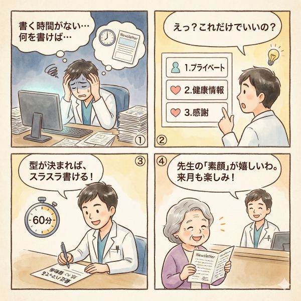 1時間でサクッと書いたレターには、かえって先生の「素」の魅力が宿ります。上手く書けなかった月があっても、一言「今月は忙しくて短くなっちゃいました!」と添えるだけで、患者さんは「先生、頑張ってるな」と微笑んでくれるはずです。