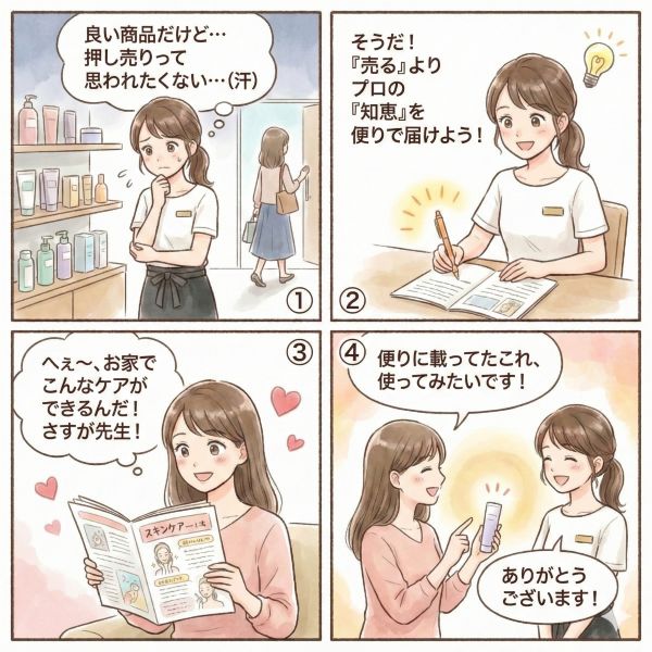 店販品は利益率も高いし、お客様のためにもなる。でも、「売り込み」と思われたくない。スタッフさんも「私、販売トークが苦手で…」と言うし、どうしたらいいんだろう。