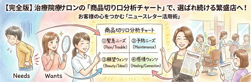 今回は、繁盛店が密かに実践している「商品切り口分析チャート(ニーズ×ウォンツ)」を紐解き、お客様の心を一瞬で掴むニュースレター活用術を伝授します。