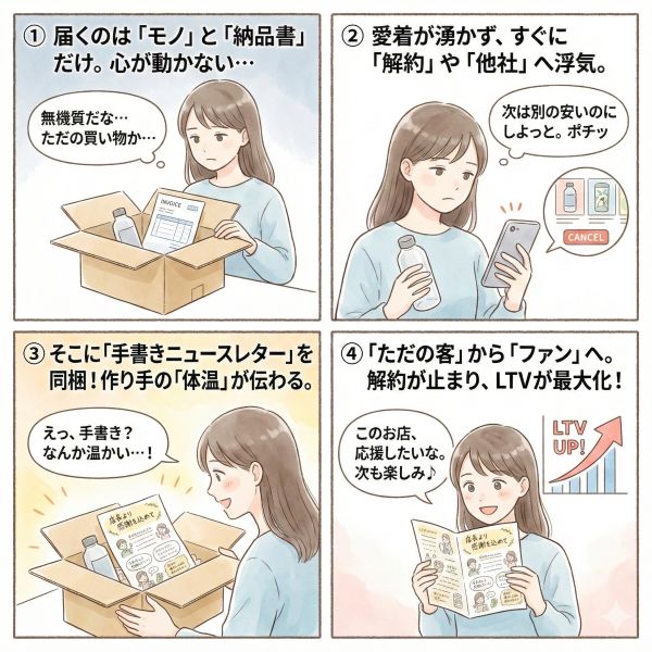 商品が届いた瞬間が、最も顧客の熱量が高い時です。そこに機械的な明細書だけでなく、温かみのある手書きのニュースレターが添えられていたらどうでしょうか? 「このお店を選んでよかった」という肯定感が、次回の注文へと繋がります。