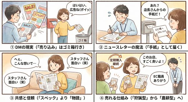 ニュースレターが売れる理由は、商品の裏側にある「人の物語(ストーリー)」を届けるからです。