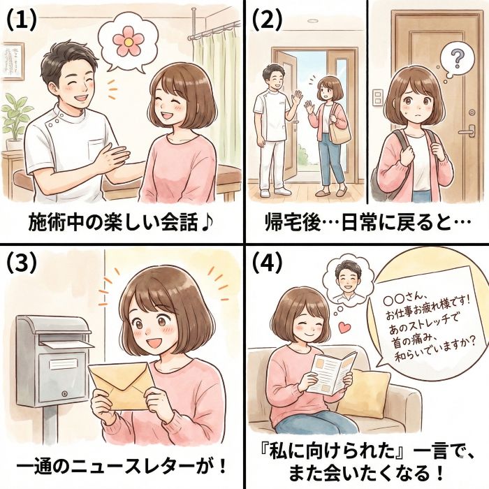 患者様は「なんとなく体がだるい」といった曖昧な理由で通院を止めがちです。ニュースレターで、「なぜメンテナンスが必要なのか」「良くなった先にどんな生活が待っているのか」を繰り返し伝えることで、患者様の中で「通い続ける理由」が明確になります。