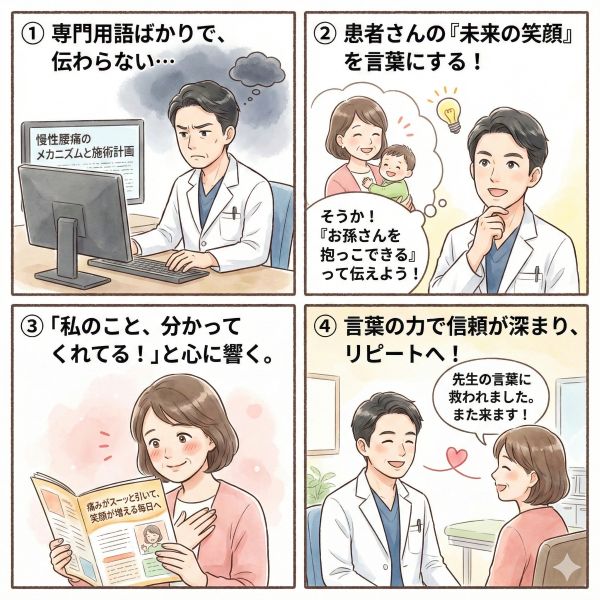 言葉は、あなたと患者さんをつなぐ”見えない糸”。その糸が太く、温かいほど、リピート率は自然と上がっていきます。