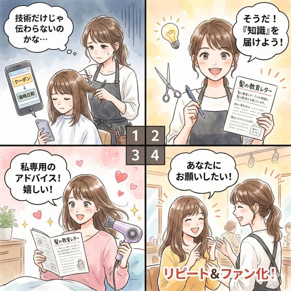 なぜなら、技術は「見えにくい」からです。お客様にとって、「このカット、すごく上手!」と実感するのは難しい。でも、「この美容師さん、髪のこと教えてくれる!」という体験は、はっきりと記憶に残ります。