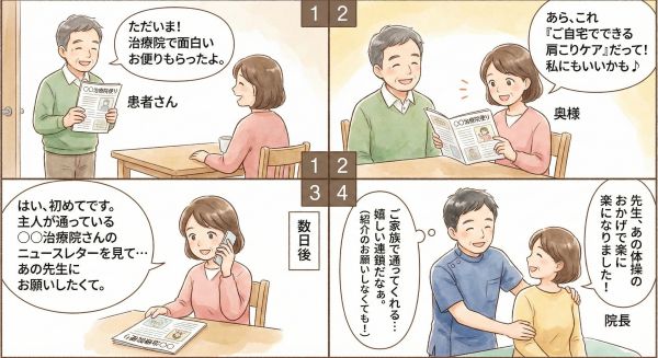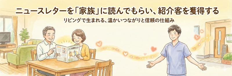 患者さんがニュースレターを家に持ち帰り、リビングのテーブルに置いておく。ご家族がパラパラと読む。「へぇ、こんな先生なんだ」「この院、良さそうだね」と、あなたの人柄や院の雰囲気が伝わる。これが、自然な紹介につながる第一歩なんです。