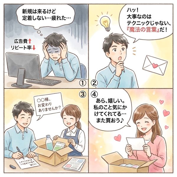 | 初回購入後 | 「選んでくれて、ありがとうございます」 | 関係のスタート |