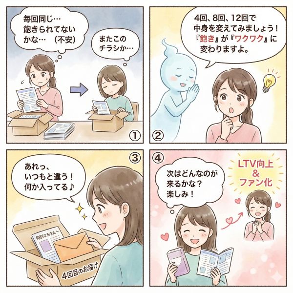 【通販】同梱物の「飽き」を防ぐ:4回、8回、12回で中身を変える戦略