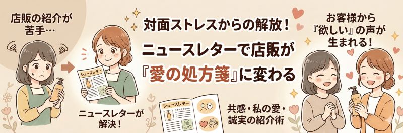 ニュースレターや紹介記事を使いながら、自然に店販品が売れる仕組みを解説します。