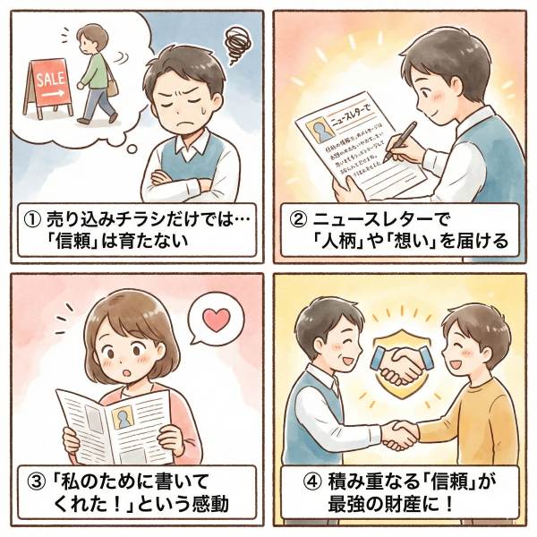 ニュースレターは、単なる情報発信ツールではありません。発行を続けることで、お客様の中に「この人なら安心」「このお店にお願いしたい」という強い信頼を育てる、最強の信頼構築ツールなのです。