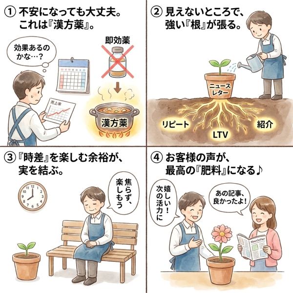 種をまいてすぐに芽が出なくても、大丈夫。 地面の下ではしっかりと根が伸びています。 ニュースレターの効果は、ある日突然「最近、あのお客様よく来てくれるな」「紹介が増えたな」という形で現れます。その時差を楽しみながら、淡々と、かつ愛を込めて種をまき続けましょう。