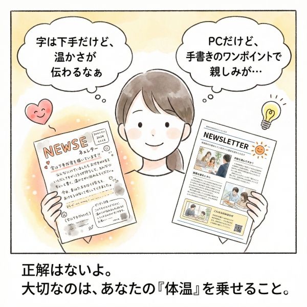A. はい、むしろ「プロすぎない」ことの方が価値があります。 お客様がニュースレターに求めているのは、洗練されたコピーライティングではなく、あなたの「体温」です。少し不器用な言葉であっても、あなたが一生懸命に書いたことが伝われば、それが最高の信頼に繋がります。綺麗な文章よりも、温かい一言。それで十分、心は届きますよ。