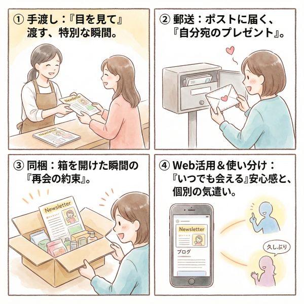 手渡し: お帰りの際、「これ、今月号です。〇〇さんに読んでほしくて」と一言添えて渡す。その一瞬のアイコンタクトが、お便りの価値を何倍にも高めます。