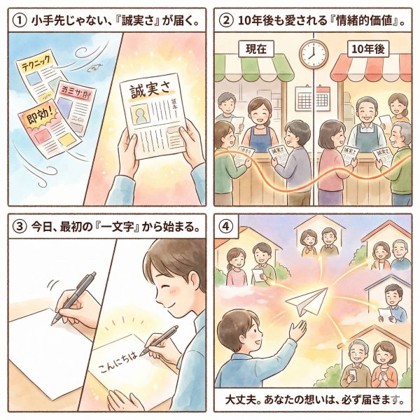 その糸を1本、また1本と紡いでいくうちに、気づけばあなたの周りには、信頼で結ばれた温かいコミュニティができあがっています。焦らなくて大丈夫。まずは今月、目の前のお客様に「こんにちは」と伝える一枚から始めてみましょう。