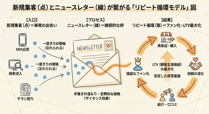ニュースレターを毎月届けることは、お客様の脳の中に「〇〇さん」という場所を確保し続ける作業です。これをマーケティング用語で「トップ・オブ・マインド」と呼びます。痛みが出たとき、髪を切りたくなったとき、サプリが切れたとき。その瞬間に、あなたの顔が真っ先に思い浮かぶ状態を作る。これだけで、リピート率は自然と底上げされます。