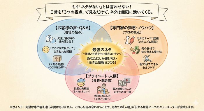 専門家としての役立つ知恵(ノウハウ): ここがニュースレターの「価値」を担保します。治療院なら「朝30秒でできる腰痛ストレッチ」、美容室なら「雨の日に広がらない髪の乾かし方」。お客様が「この記事、とっておこう」と思える実用的な情報を、図解やステップ形式で伝えます。