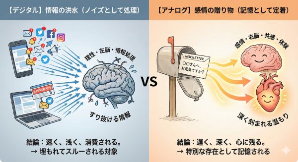 [デジタル情報の脳内処理 vs アナログ情報の感情処理の比較図]