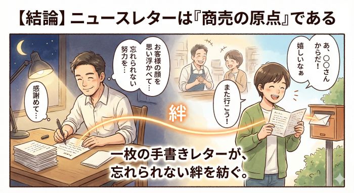 商売とは、人と人との心の通い合いです。その原点を忘れず、一枚のレターに魂を込める。その姿勢がある限り、あなたの商売が揺らぐことはありません。ニュースレターは、あなたとお客様を繋ぐ「命綱」であり、あなたが商売人として生きた証(あかし)そのものなのです。