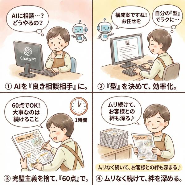 今の時代、一人で真っ白な紙に向き合う必要はありません。AIを「相談相手」にしてみてください。「今月はこんなことがあって、お客様にこんなことを伝えたいんだけど、構成案を作ってくれる?」と話しかけるだけで、執筆のハードルはぐっと下がります。