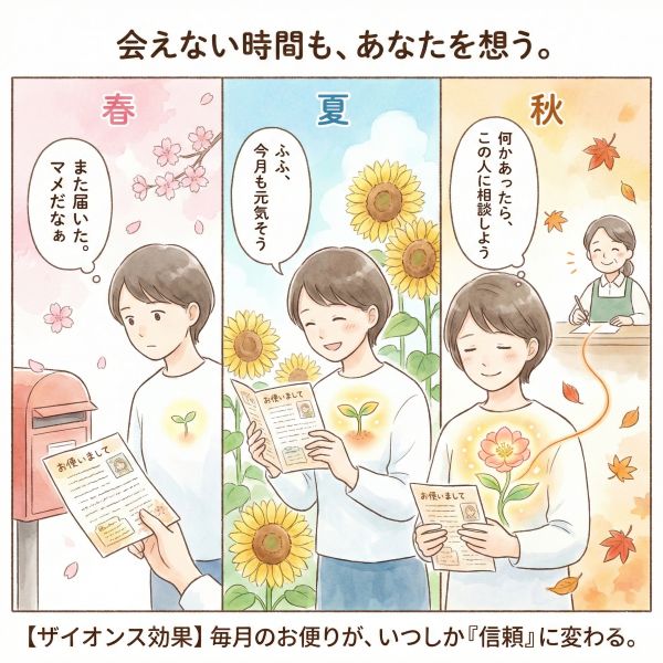 毎月届くニュースレターは、いわば「毎月、笑顔で挨拶に伺う」のと同じです。直接会っていない時間も、あなたのニュースレターがお客様のそばに寄り添うことで、「困ったときは、あの先生(店長)に相談しよう」という揺るぎない信頼が育まれていきます。