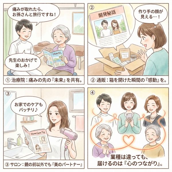 あなたのお店で起きた「小さな感動」を共有しましょう。 「長年の悩みが解消して、旅行に行けたと仰っていました」 そんなストーリーを載せることで、読んでいるお客様は「私もそうなれるかも」と未来に希望を持てるようになります。自慢話ではなく、「一緒に喜びを分かち合う」というスタンスが、共感の輪を広げます。