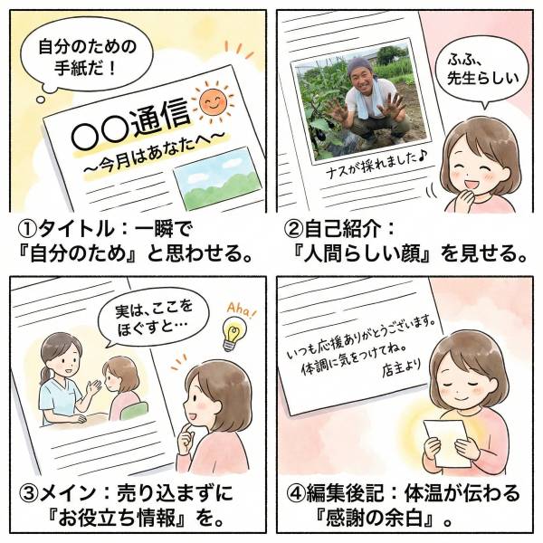 ニュースレターは「書く人自身を癒やすツール」でもあるということです。 「何を売ろうか」と悩むのではなく、「どう喜んでもらおうか」と考える時間は、経営の中で最も純粋で幸せな時間。そのワクワクした気持ちは、必ず紙面を通じてお客様に伝わります。
