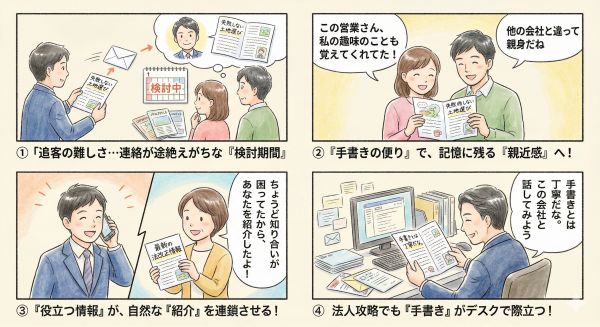 効果: 1ヶ月に一度、手書きの便りが届くことで、お客様の脳内で「営業マンAさん」が「知り合いのAさん」に昇格します。他社が電話で「いかがですか?」と急かす中、あなたは「役立つ人」として記憶に残り続けます。