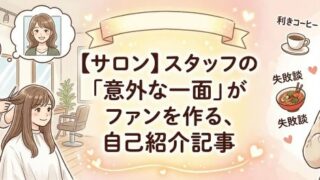 リピート・ファン化 【サロン】スタッフの「意外な一面」がファンを作る、自己紹介記事 サロンの指名が増える自己紹介記事の書き方とは?本記事では「意外な一面」を活かしたスタッフ自己紹介の作り方を解説。心理学の視点から、親近感を生みファンを増やすサロンマーケティングの実践方法を紹介します。 2026.03.12 リピート・ファン化