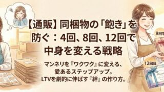 集客・販促 【通販】同梱物の「飽き」を防ぐ:4回、8回、12回で中身を変える戦略 通販を続けていると、こんな悩み、ありませんか? 「初回は反応がいいのに、リピートが伸びない…」 「同梱チラシ、毎回同じで正直マンネリしている…」 「作り替える時間も余裕もなく、つい放置してしまう…」でも大丈夫です。同梱物は“少しの設計”で、... 2026.02.24 リピート・ファン化集客・販促